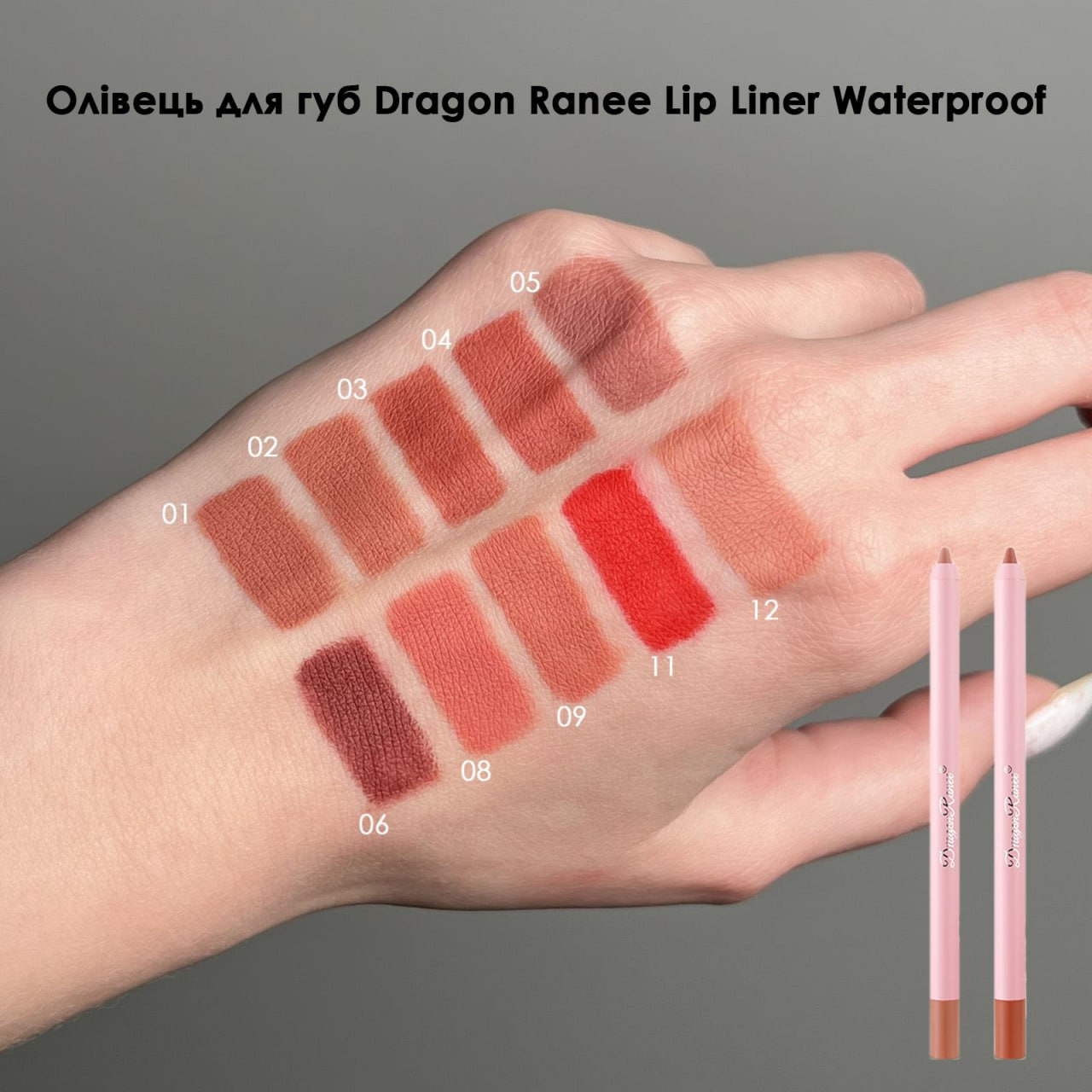 Олівець для губ Dragon Ranee Lip Liner Waterproof — це супер стійкий засіб для макіяжу вуст на гелевий основі, який дуже легко розподіляється, тушується, не сушить шкіру та має надзвичайну стійкість. Широка палітра з 10-ти відтінків дозволяє підібрати саме той, який підійде для макіяжу губ: можливо ви бажаєте щоб олівець був в тон до помади, на тон нижче чи вище, або хочете просто класичний нюд для легкого щоденного макіяжу. Гелеві олівці для губ всього за кілька хвилин застигають і стійко тримаються протягом дня. Олівець точиться, тому ви завжди можете провести найтоншу лінію, яку тільки побажаєте. Ним можна заповнювати всі губи, обводити тільки по контуру чи всередині губ, комбінувати з блисками, помадами чи тінтами на будь-який смак.